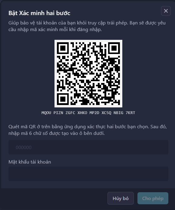 Cần cài đặt ứng dụng xác thực như Authy hoặc Google Authenticator.
