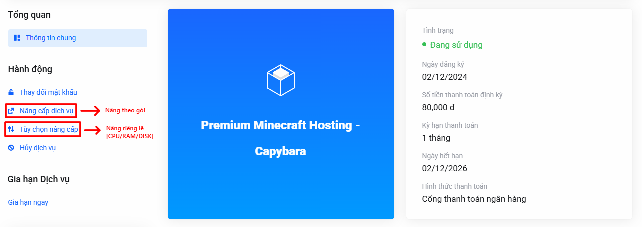 Bước 2: Tại đây bạn có thể nâng cấp theo gói khi ấn vào Nâng cấp dịch vụ Nâng cấp riêng lẽ [CPU/RAM/DISK/IP V4] tại tùy chọn nâng cấp.