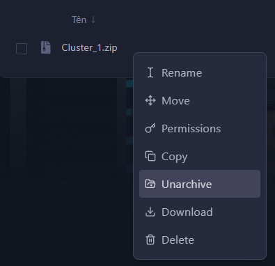 Bước 9: Chuột phải vào file Cluster.zip và chọn Unarchive.