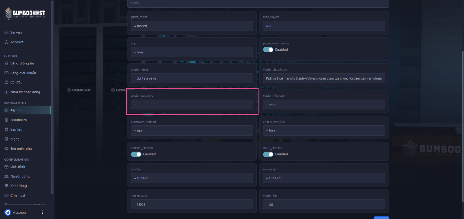 Bước 4. Tìm đến cluster_passwordđặt password cho máy chủ bạn.